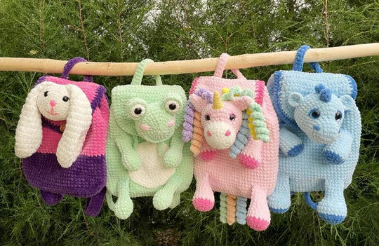 Craft your unique backpack friend using the magic of crochet! 🧶✨ Dive into this creative journey and bring these enchanting characters to life! ✨🐉🦄🐸🐰